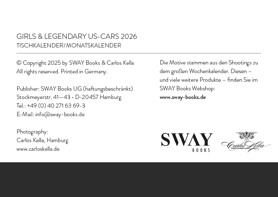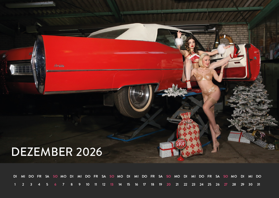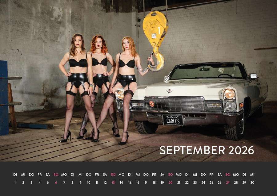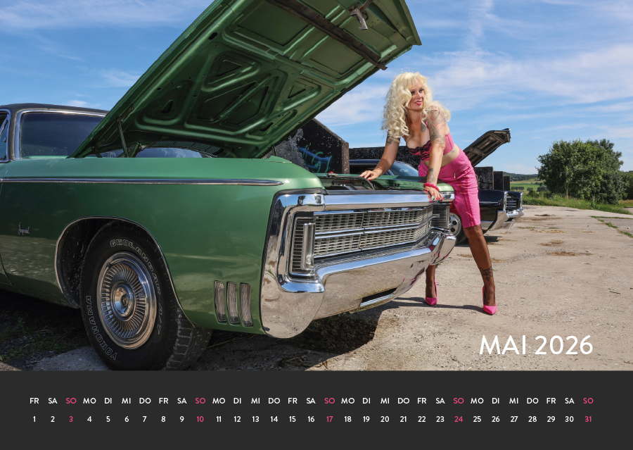 Mit 12 Monatsmotiven aus den Shootings zum großen Wochenkalender bringt er Pin-up-Power und US-Car-Spirit direkt auf den Schreibtisch. Klein im Format, groß im Stil – der perfekte Begleiter durch das Jahr!